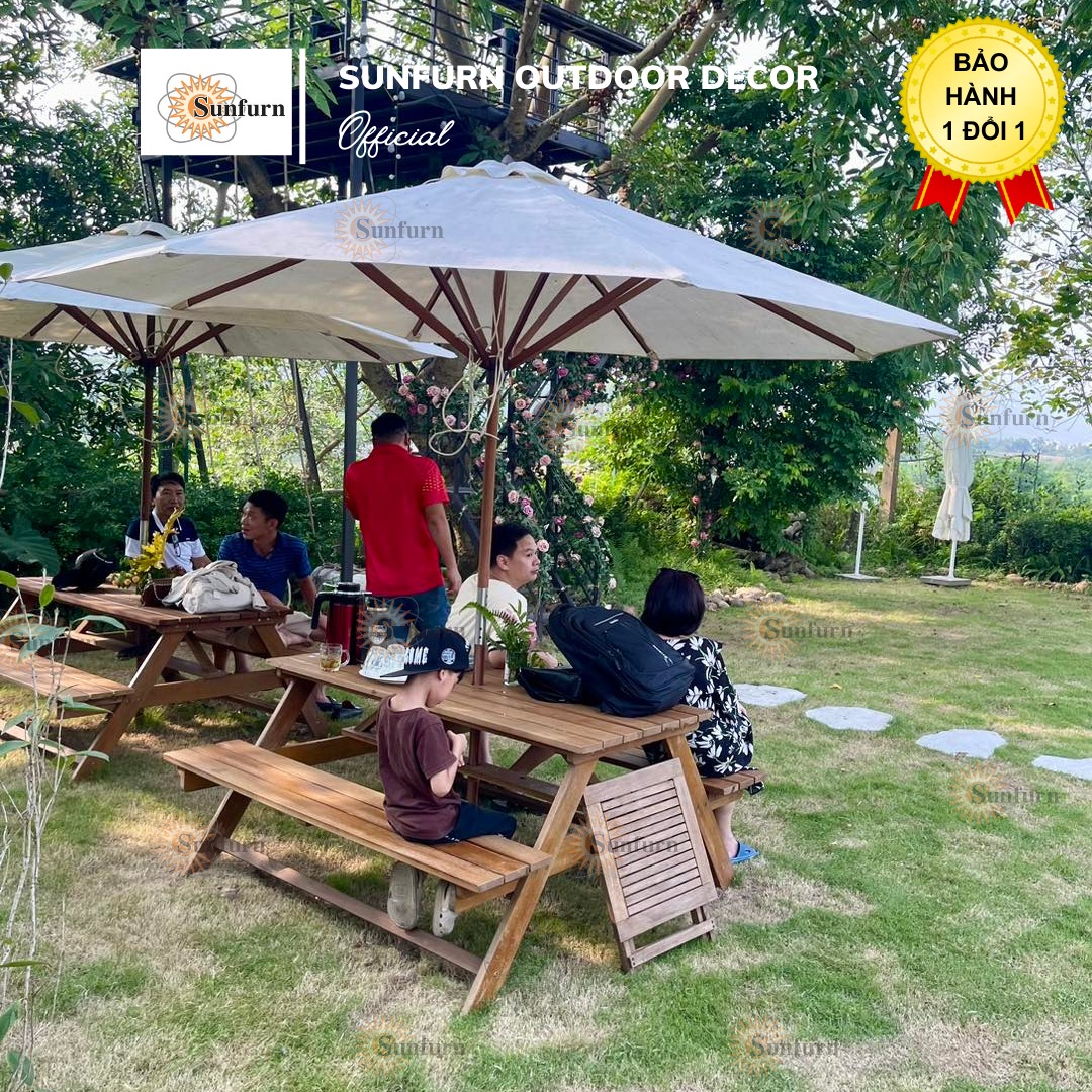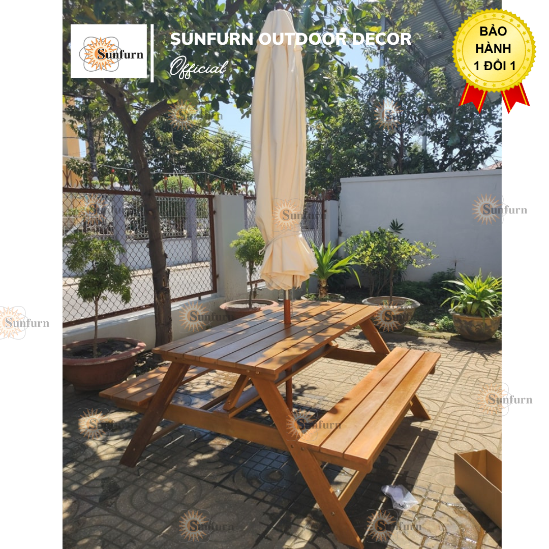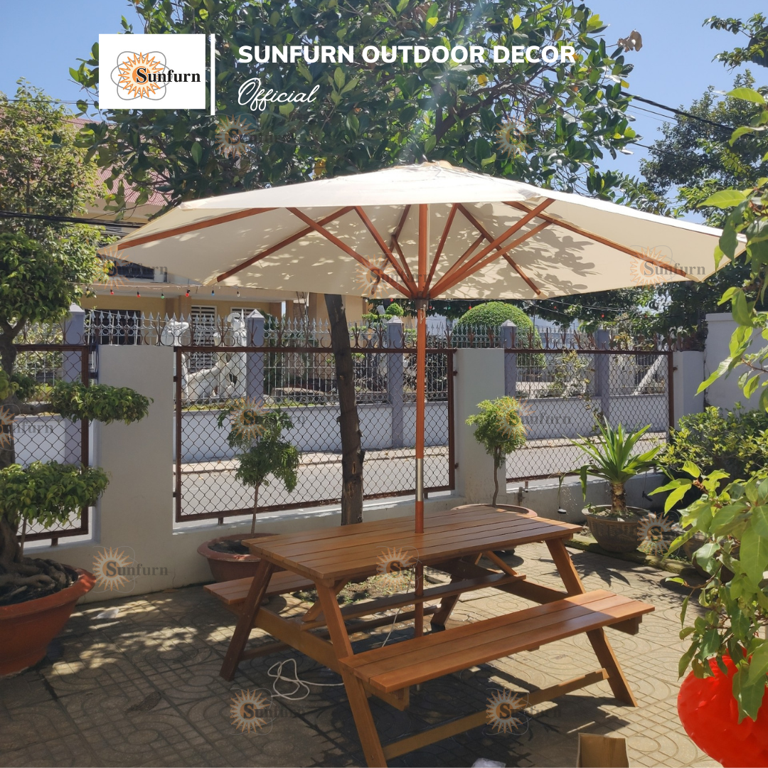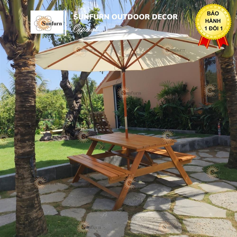 Bộ Bàn Picnic Liền Ghế Gỗ Chò Tự Nhiên SUNFURN - Kèm Dù Gỗ Sân Vườn 3m, Chống Mối Mọt, Chịu Lực 350kg – Giải pháp hoàn hảo cho không gian sân vườn hiện đại