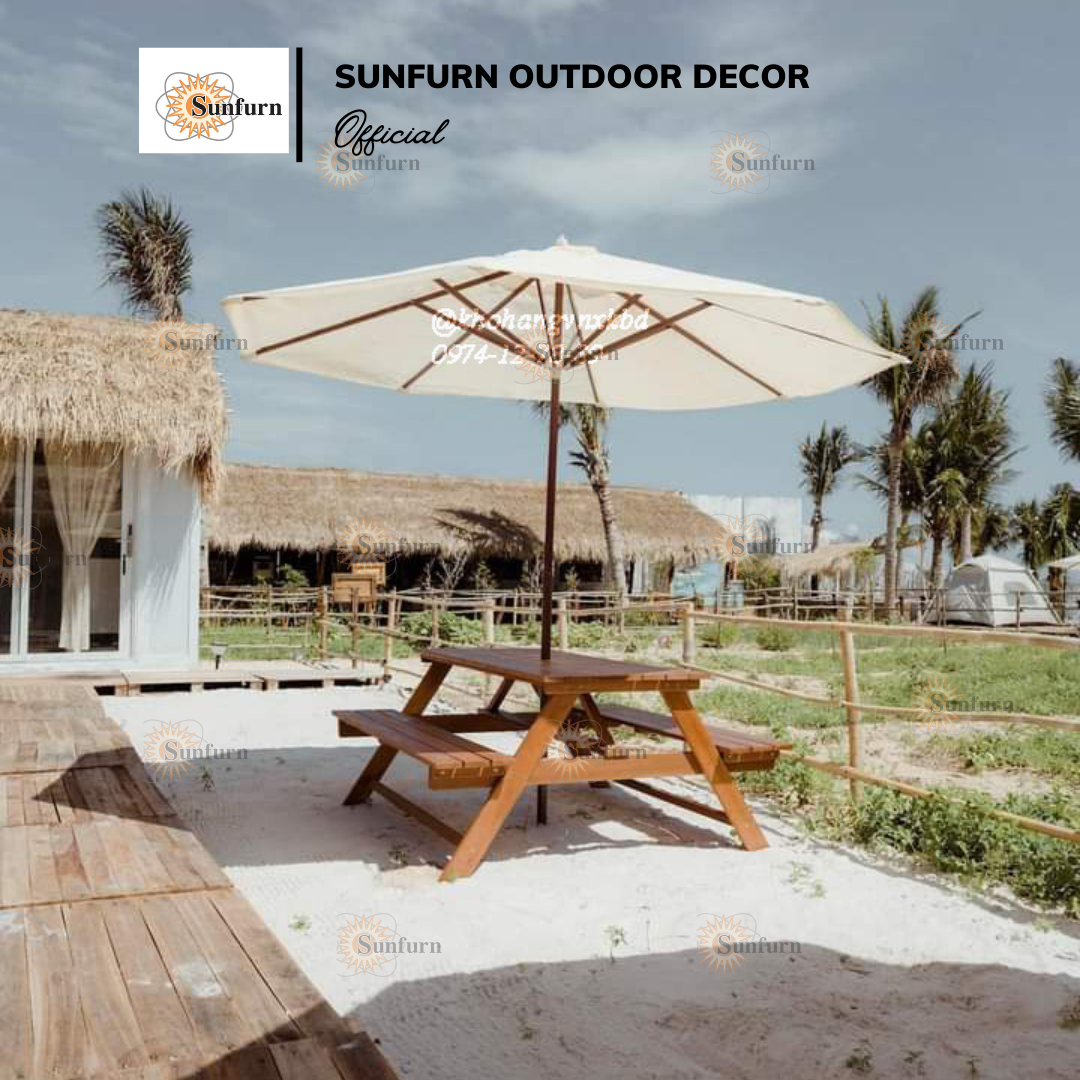Thông tin về Bộ Bàn Picnic Liền Ghế Gỗ Chò Tự Nhiên SUNFURN - Kèm Dù Gỗ Sân Vườn 3m