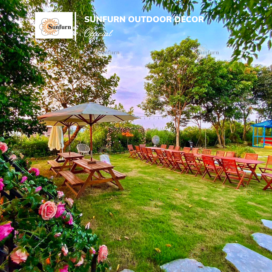 Bộ Bàn Picnic Liền Ghế Gỗ Chò Tự Nhiên SUNFURN - Kèm Dù Gỗ Sân Vườn 3m được ứng dụng cho sự kiện ngoài trời