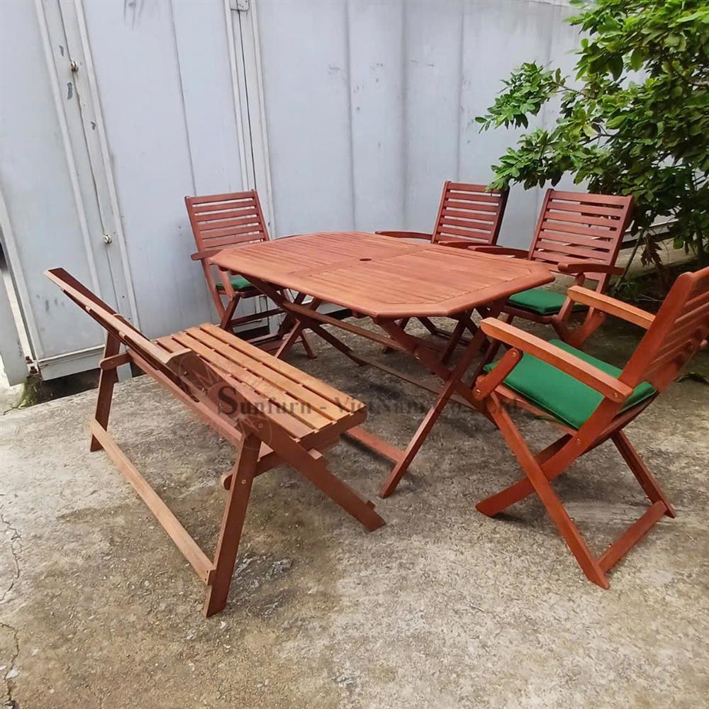 Combo bàn Octa 140 cm và 4 ghế xếp gỗ có tay và 1 bench xếp ngoài trời