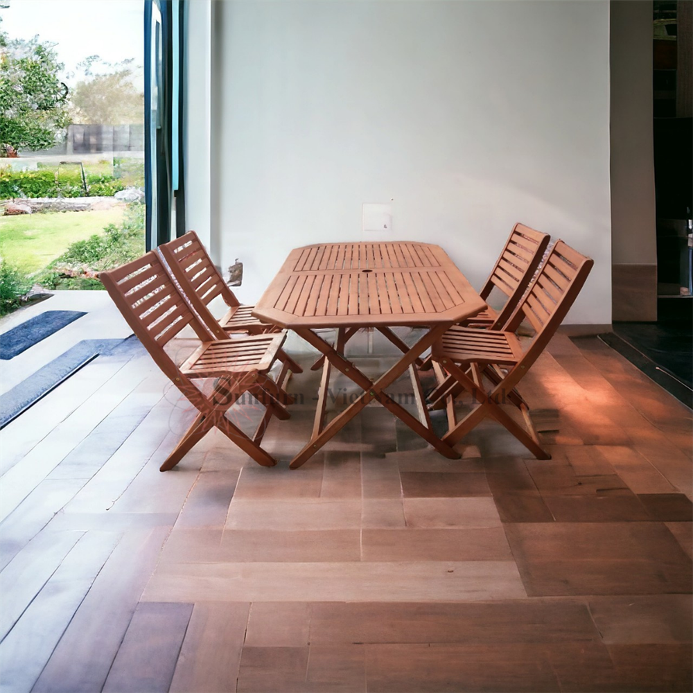 Trong xu hướng thiết kế hiện đại, bàn ghế sân vườn gỗ ngày càng được nhiều gia đình, quán cà phê, homestay và resort ưa chuộng bởi sự tự nhiên, bền bỉ và tiện lợi. Nổi bật trong số đó là combo bàn Octa 140 cm và 6 ghế xếp gỗ không tay, mẫu sản phẩm được sản xuất theo tiêu chuẩn xuất khẩu, vừa đảm bảo công năng sử dụng, vừa mang lại tính thẩm mỹ cao cho mọi không gian ngoài trời.