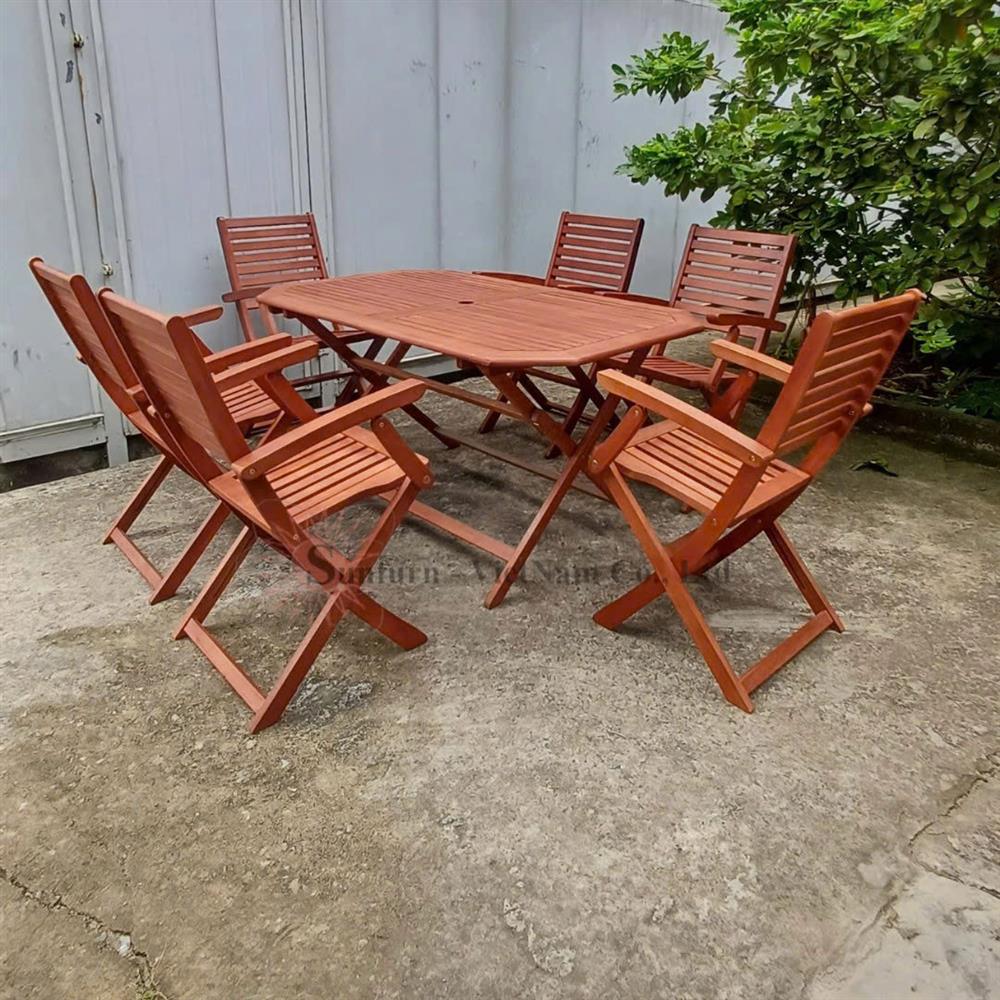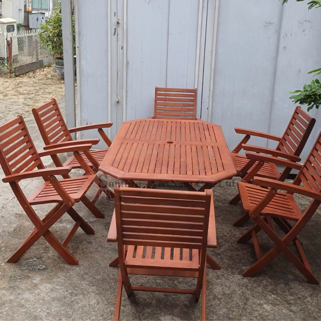 Combo bàn Octa 140 cm và 6 ghế xếp gỗ có tay ngoài trời