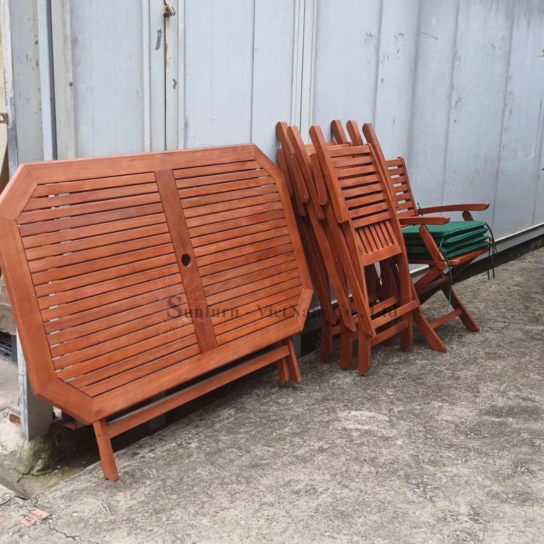 Combo bàn octa 140 cm và 6 ghế xếp gỗ có tay – giải pháp hoàn hảo cho sân vườn hiện đại