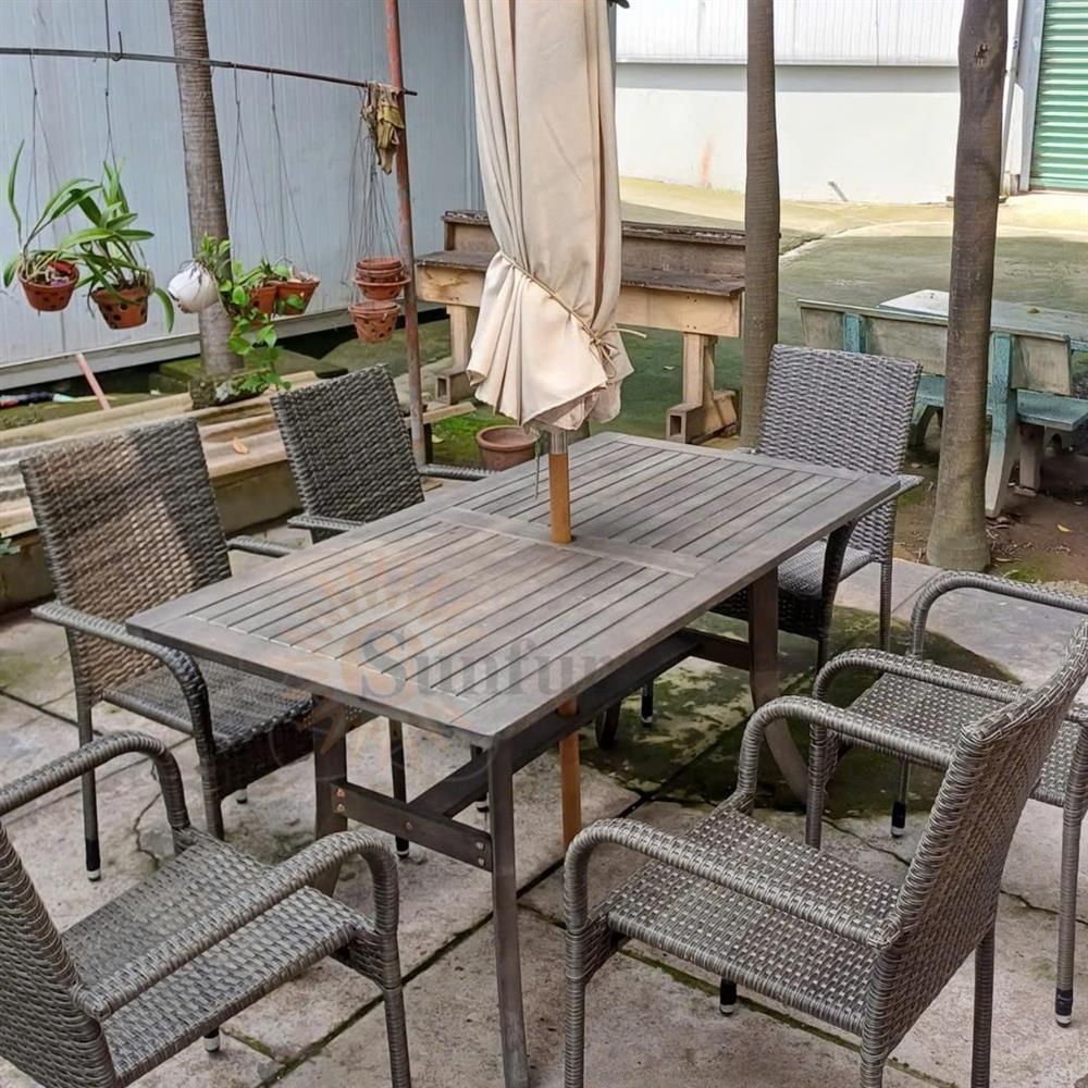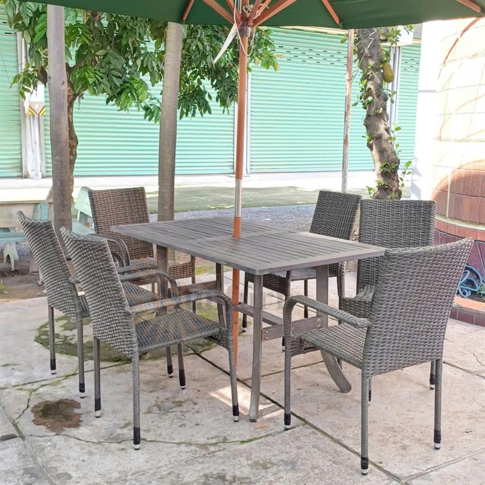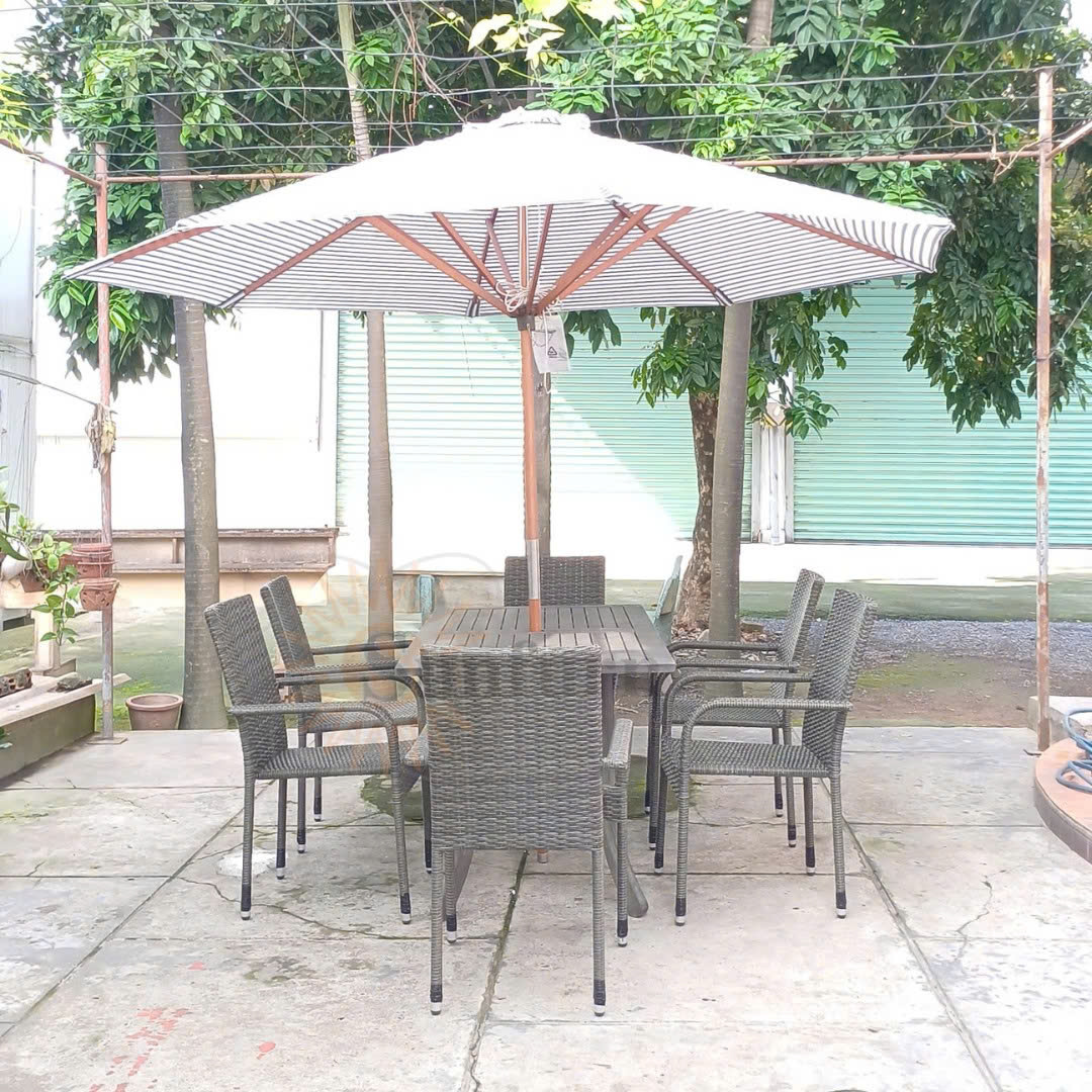 Combo bàn VF2 và 6 ghế stacking xám kèm dù gỗ 300 cm sân vườn