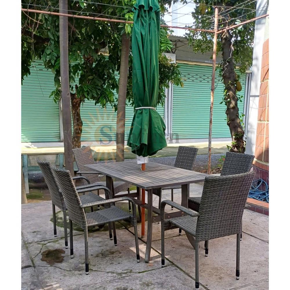 Bàn VF2 và 6 ghế stacking xám kèm dù gỗ chính tâm sân vườn size 300 cm màu xanh lá