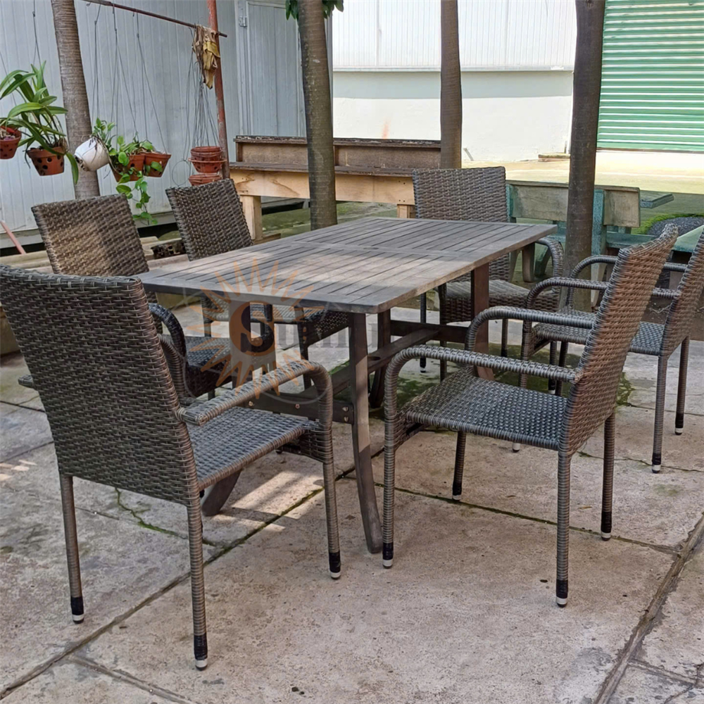 Công nghệ xử lý bề mặt tiên tiến: Mỗi bộ bàn ghế đều được phủ lớp dầu bảo vệ chuyên dụng chống tia UV và ẩm mốc. Điều này giúp gia chủ dễ dàng vệ sinh đồ gỗ sau mưa bão mà không lo bong tróc sơn hay bạc màu.