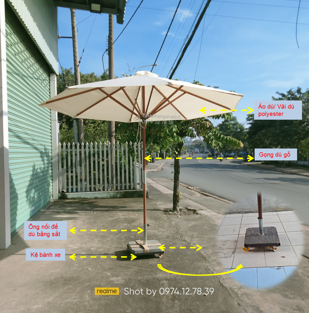 Đế dù: Đế đá cement hoa cương cao cấp, kèm bánh xe tiện lợi di chuyển.