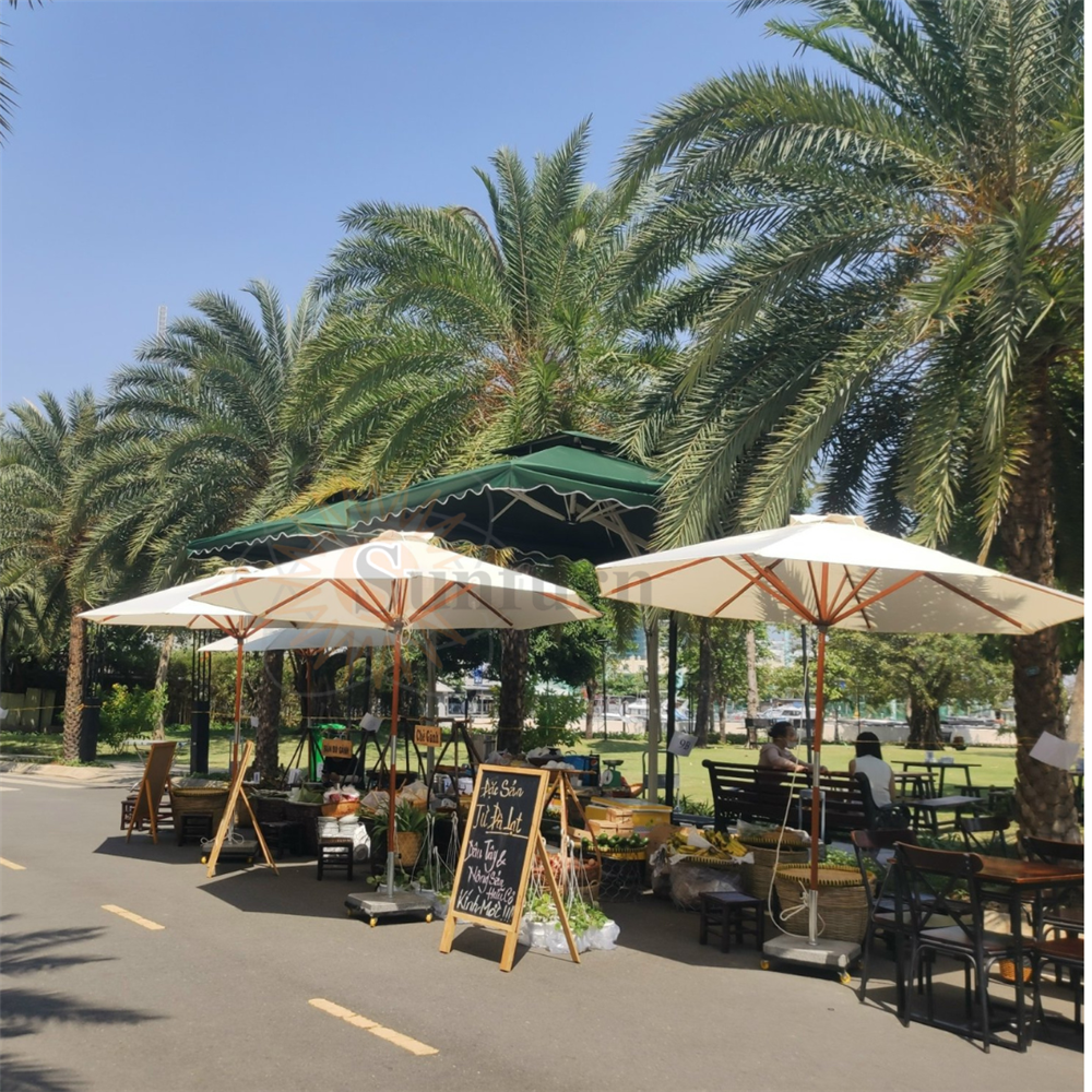👉 Mẫu dù gỗ size 250 cm với đế đá hoa cương kèm bánh xe giải quyết tất cả: vừa đẹp – vừa bền – vừa tiện lợi.