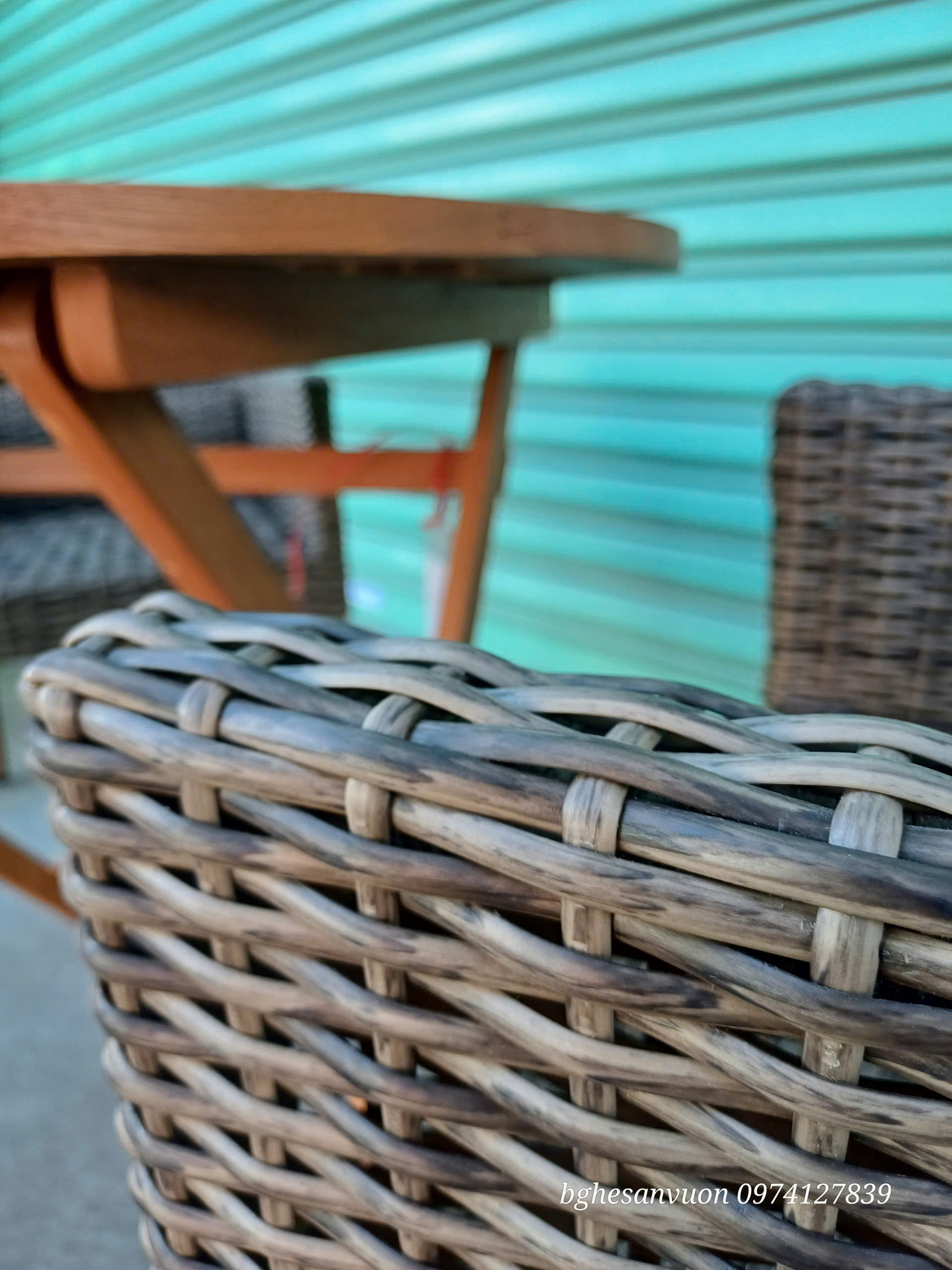 Chất liệu: Khung sắt sơn tĩnh điện chống gỉ, chân gỗ chắc chắn, dây mây nhựa bán nguyệt đan thủ công.