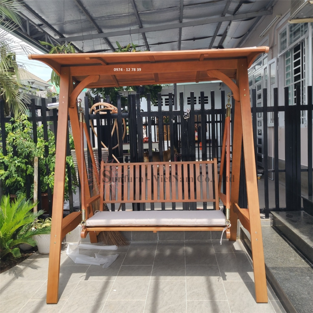 Xích đu gỗ ngoài trời 2 chỗ bằng gỗ bạch đàn Nam Phi, mái che khít chống thấm, phôi gỗ dày chắc chắn. Sản phẩm chuẩn xuất khẩu, tặng kèm nệm ghế, số lượng có hạn.