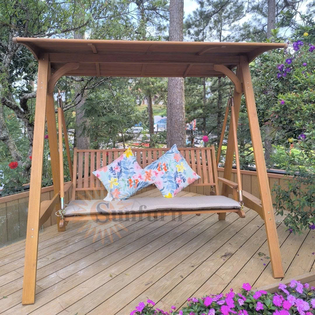 Với thiết kế chuẩn xuất khẩu, kiểu dáng hiện đại nhưng vẫn giữ được nét gần gũi tự nhiên, bộ xích đu mái gỗ 3 chỗ chính là sự kết hợp hoàn hảo giữa công năng và thẩm mỹ, thích hợp cho gia đình, quán cà phê sân vườn, homestay hay resort cao cấp.