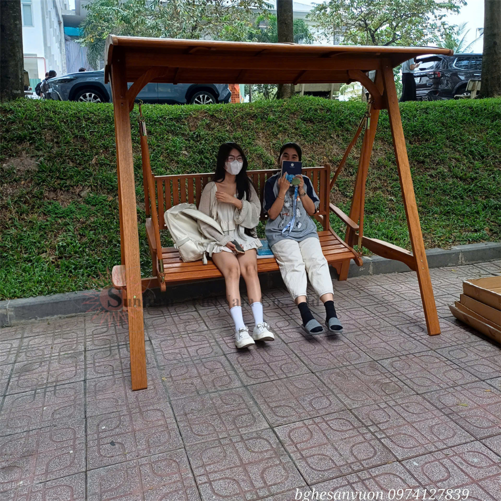 Xích đu gỗ 3 chỗ sân vườn, đặt tại trường ĐH Kinh Tế Luật - Thành phố Hồ Chí Minh