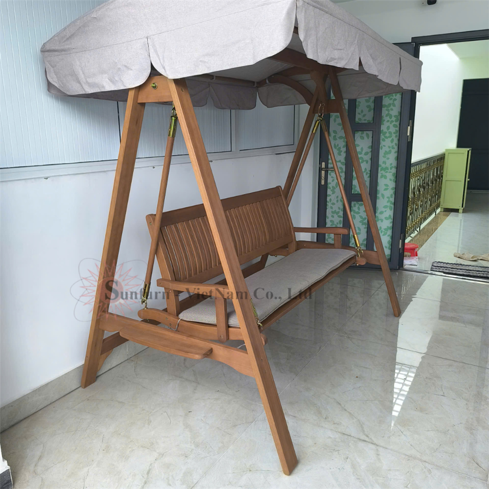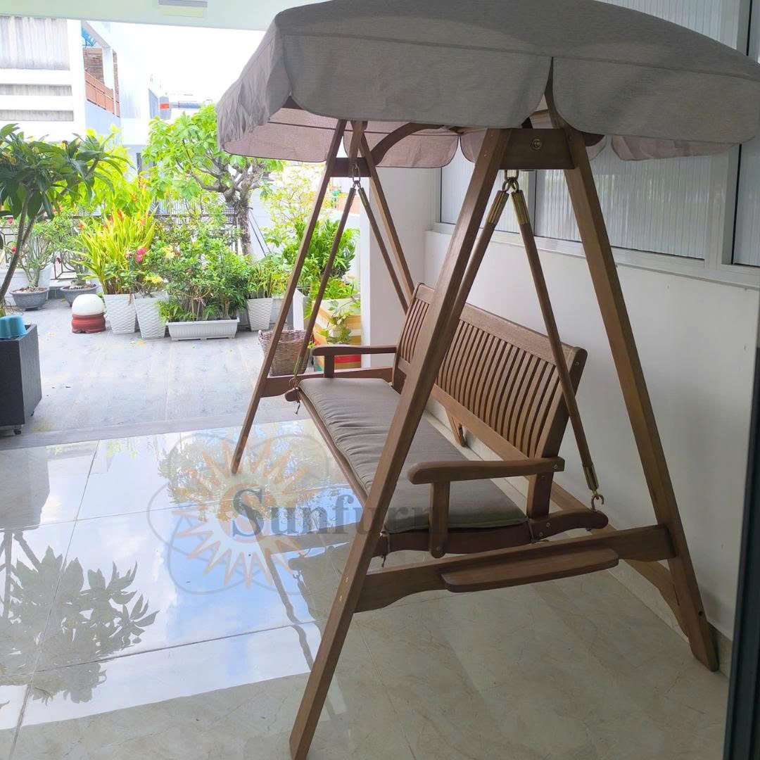 Bộ khung xích đu gỗ mái vải sân vườn với kích thước 3 chỗ, chụp tại SUNFURN VN